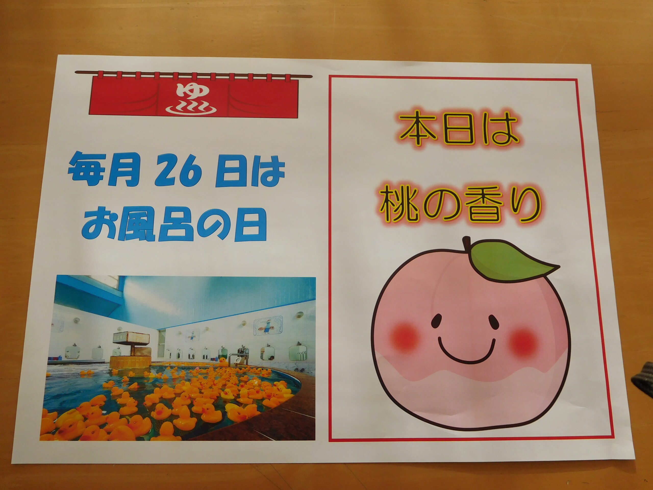 本日は、桃の香りの入浴剤を使用し、いつもとはひと味違う、入浴時間をお楽しみいただけますよ♪