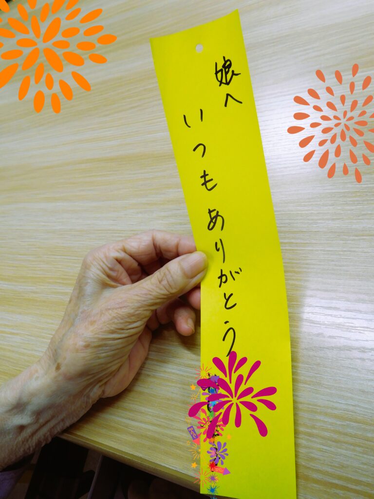 7月を迎え、施設内では七夕飾りを飾りました。入所の皆さまや通所リハビリの皆さまが書いてくださった短冊には、利用者様の願いや想いがずらり!皆さまの願いが空に届き、穏やかな日々が続きますように。お越しの際は、ご覧いただき夏の訪れを感じていただければ幸いです♪