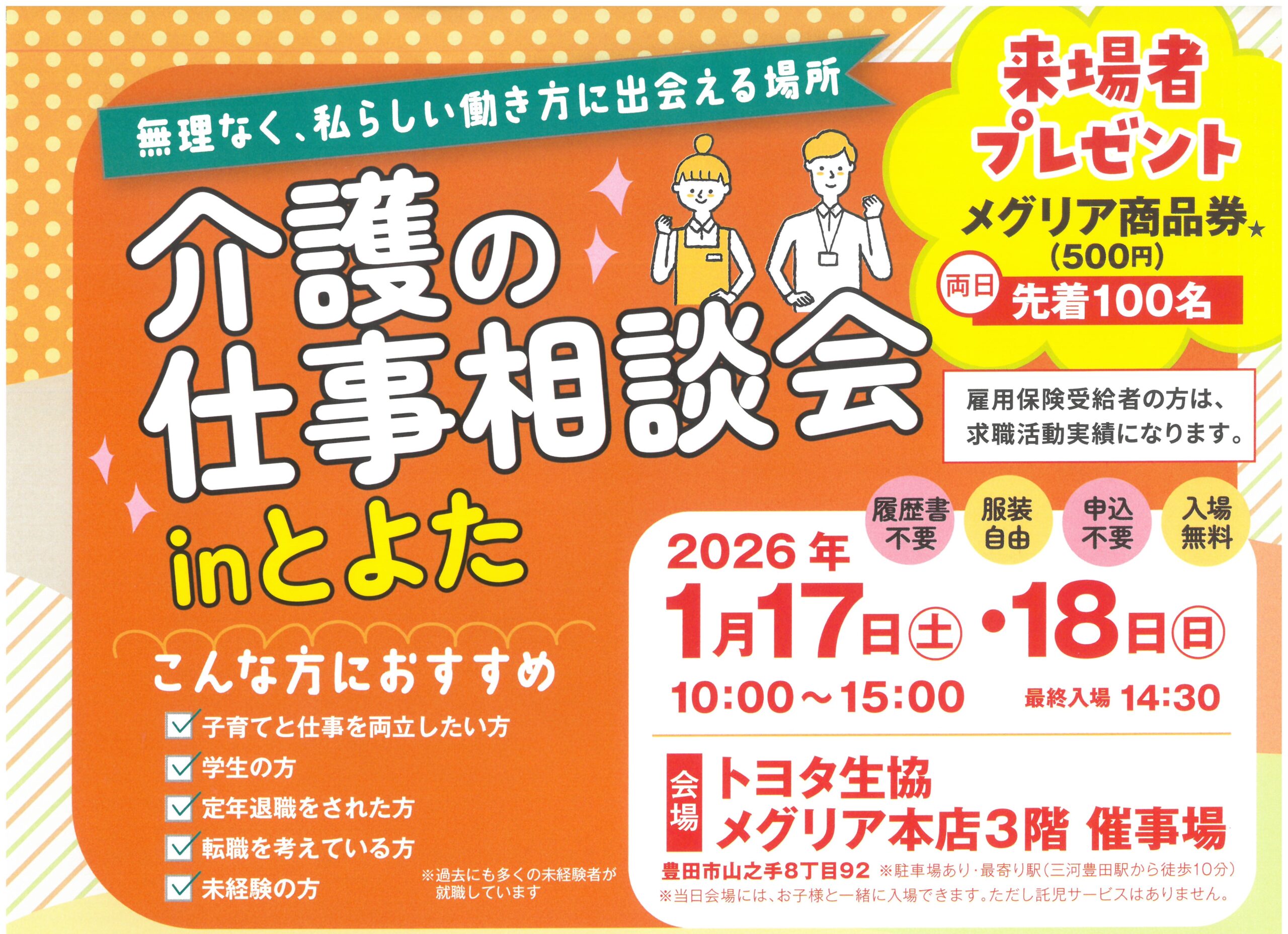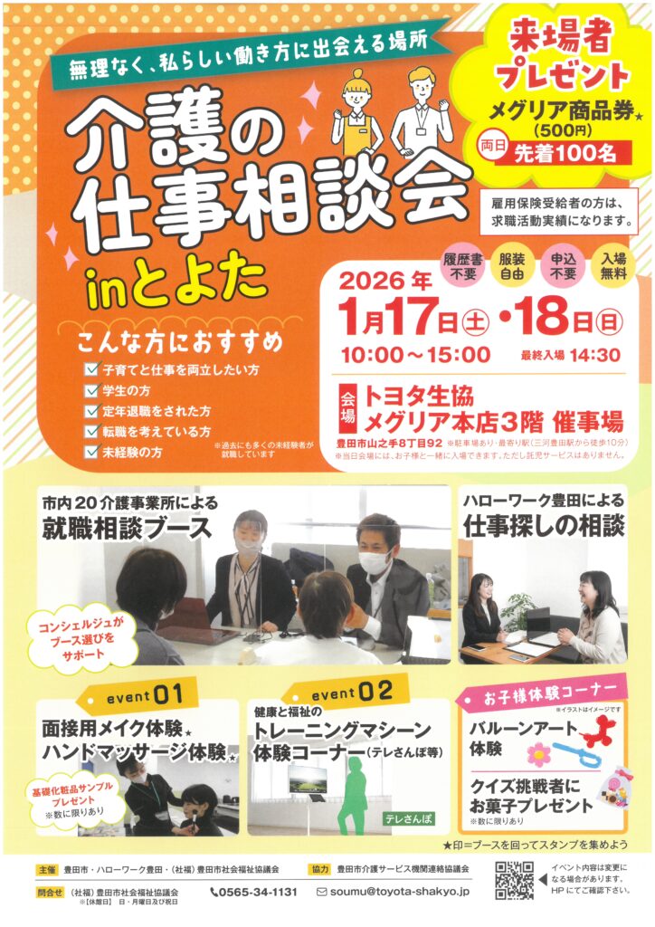 2026年1月17日から2日間、豊田市・ハローワーク豊田・豊田市社会福祉協議会が主催の、「介護の仕事相談会Inとよた」が、メグリア本店3階にて開催されます。